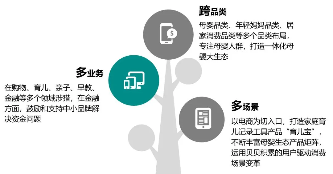 以电商为切入点,打造购物、育儿、亲子、早教等全方位母婴生态.