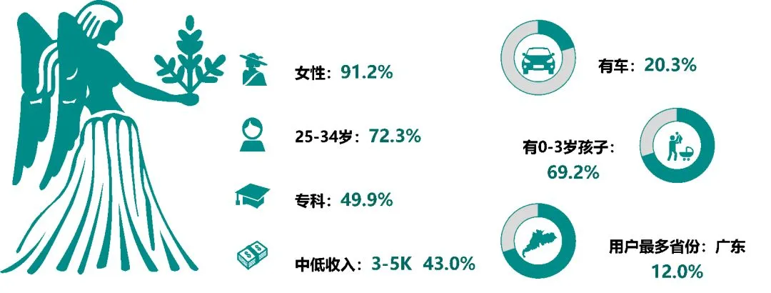 女性为主,占比超九成,中低收入居多,广东用户比例最大。