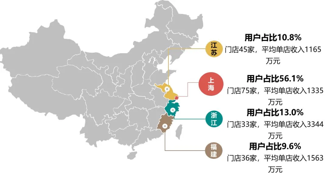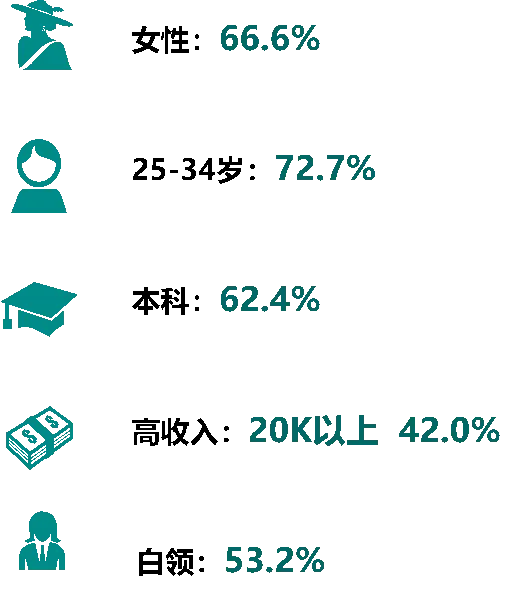 主要聚集在江浙沪与福建地区,用户主要是本科学历高收入的白领女性。