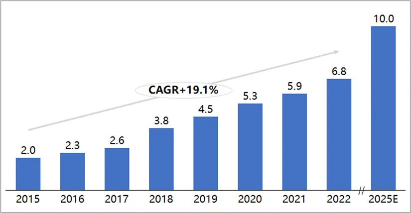 根据工信部“新时代工业和信息化发展”系列新闻发布会,我国新材料产业产值从2015年的2万亿元增加到2022年的6.8万亿元(占全球新材料产业产值比重近 1/4),年复合增速达19%。同时根据工信部预测,随着中国新能源汽车、半导体等行业的发展,带动中国新材料市场规模进一步增长,“十四五”期末新材料产业规模将达到10万亿,规划时期年均复合增长率约13.5%。