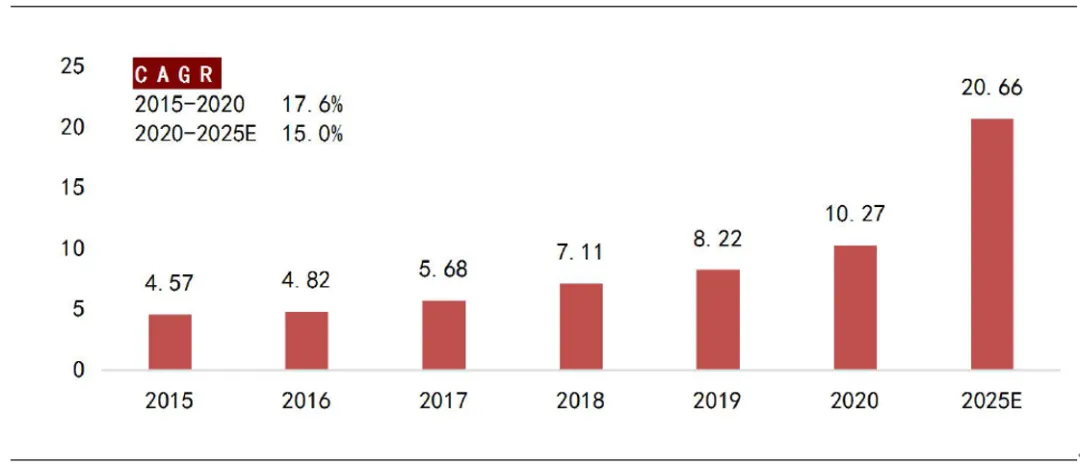 2015-2020 年中国碳纤维市场规模(含预测,单位:亿美元)
