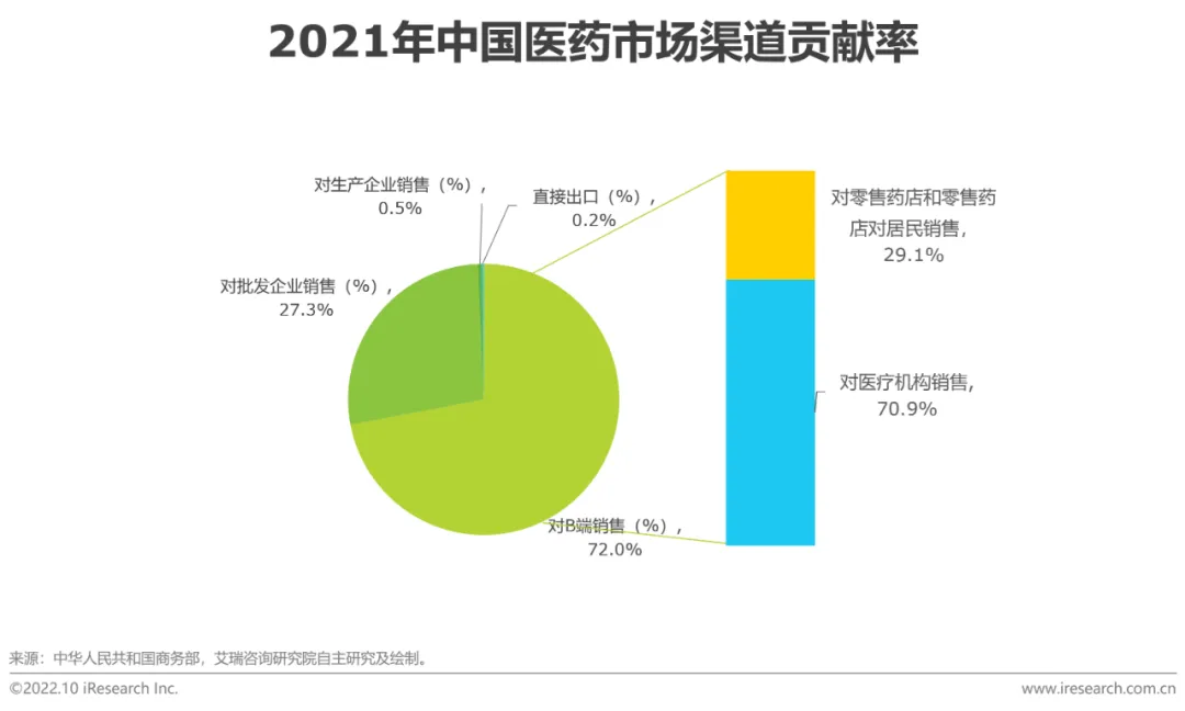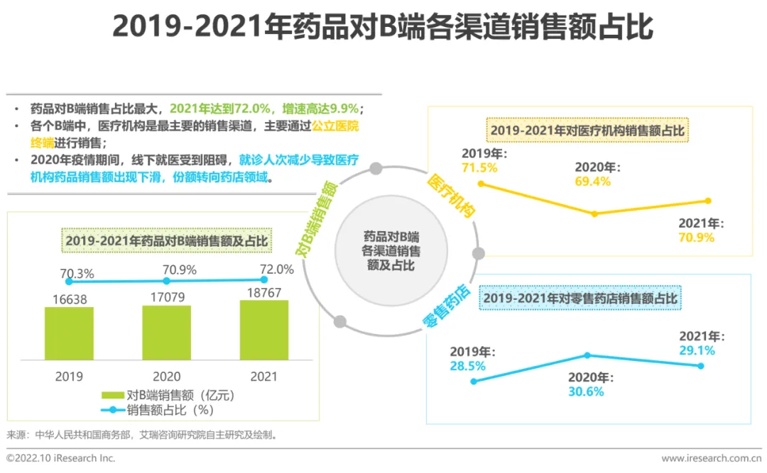 在药品的流通过程中,药品对B端销售额占比最大,超过70%,2020年受疫情影响,线下就医受到物理空间阻隔,医疗机构就诊人次有所减少,这使得对B端销售增速低至2.7%,但随着疫情的逐渐平稳,增速上涨至9.9%,这说明线下就医需求被拉动回升,并且始终处于诊疗刚需的地位。在对B端的销售渠道中,医疗机构始终占据主要地位,这主要是医疗机构中的公立医院是民众诊疗就医的主要场所,同时,2020年疫情期间,零售药店也发挥其便民可及性优势,销售额占比有所提高。