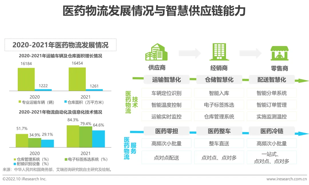 随着医药流通的不断发展,医药物流技术水平不断提高,2021年医药物流企业运输车辆达16454辆,仓库面积1261万平方米。同时,医药物流供应链技术与服务实现全面升级,智能温度控制、电子标签拣选、智能订单管理等技术实现了医药物流的信息化、智慧化;医药零担、医药整车、医药冷链等服务模式更加契合市场药品运输需求,共同助力医药电商B2B提高药品物流与配送能力,通过智慧化运输、仓储与专业化配送实现药品的快捷、高效流转,进而更好地迎合药品流通需求。