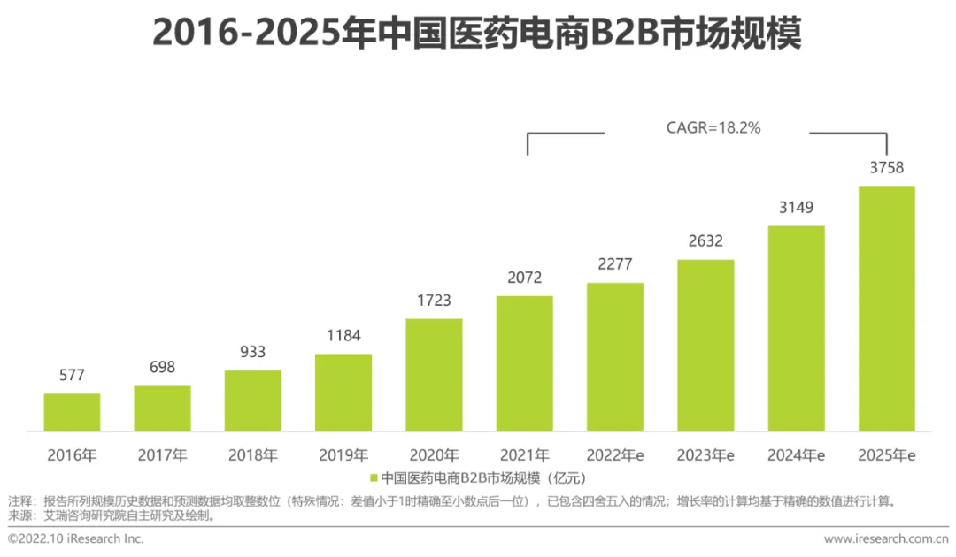 2016-2021年间,医药电商B2B市场增长迅速,2019年B2B模式交易规模突破千亿元。2020年之后受疫情影响,电商购药成为首选,医药电商B2B趁势而起,实现高速增长,2021年市场规模达到2072亿元。在市场成长性方面,目前医药电商B2B服务的对象多为药店、诊所、民营医院等,未来一方面,医药流通行业“十四五”规划促进了流通行业集中度提升,电商B2B高质量发展;另一方面,院外市场发展迅速,采购量大幅增加,医药电商B2B市场规模将进一步扩大。因此可以预见,在政策与市场不断完善的综合作用下,中国医药电商B2B市场规模2025年预计达到3758亿元,发展空间巨大。