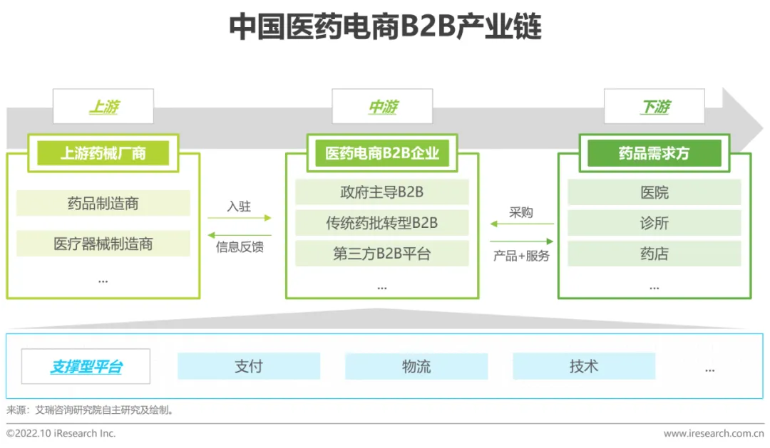 中国医药电商B2B产业链上游包括药品制造商、医疗器械制造商等。随着互联网的应用普及,药品流通逐渐转移至线上的B2B平台,在支付、物流、技术等平台的支撑下,达到为流通行业提速增效的目的。中游医药电商B2B包含政府主导B2B、传统药批转型B2B以及第三方B2B平台,三种模式共同发挥作用。下游需求方包括医院、诊所、药店等多个终端。产业链头部的医药电商B2B企业大都凭借其规模效应把握上游品种优势与下游资源优势,从而贯穿产业链上中下游各个环节,实现全产业链的深度布局。