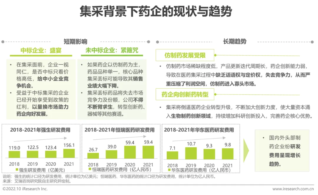 医药集采以招投标的形式购进药品,对于医药企业的影响从两个方面看:短期内,对中标企业来说,有技术实力的中小药企凭借集采中标以量换市场,或与大药企抢占市场份额;未中标企业方面,以仿制药为主且品种单一的企业丢标可能造成业绩大幅下跌,不得不转向其他赛道。长远来看,仿制药逐渐缺乏话语权与定价权,发展空间将被挤占,这倒逼药企转型升级,加大医药研发投入,以积极向创新药领域转型。