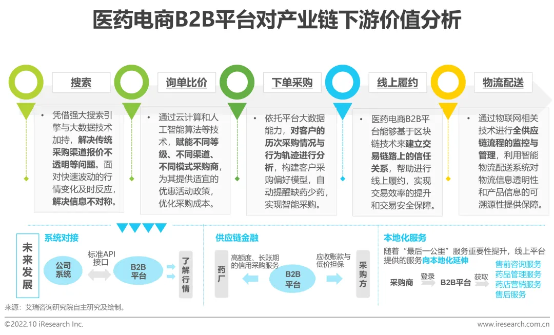 医药电商B2B平台凭借其深厚的技术积累与技术能力,优化平台采购的全链路流程,为下游买家提供一站式采购解决方案,实现智能采购。平台从商品搜索、询单比价、下单采购、线上履约直至物流配送各个方面,依靠大数据、区块链和物联网等技术,帮助采购商实现采购信息透明化、产品服务推荐定制化、签约流程线上化以及溯源信息可靠化等。未来平台将凭借其科技优势继续渗透采购环节,在系统对接充分、供应链金融可靠、本地化服务完善等方面持续发力,为企业赋能。