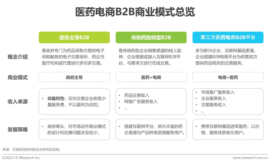 行业现状:医药电商B2B位于医药流通产业链的中游,以数字化方式革新产业链上下游之间的联系方式,节约流通成本,提升流通效率。按照发起方的不同进行划分,医药电商B2B可以分为政府主导的医药电商B2B、传统药批转型B2B以及第三方医药电商B2B平台,各模式市场特征与产品体系各不相同,同时以其数字化、便捷化服务共同助力医药流通的高效运转。