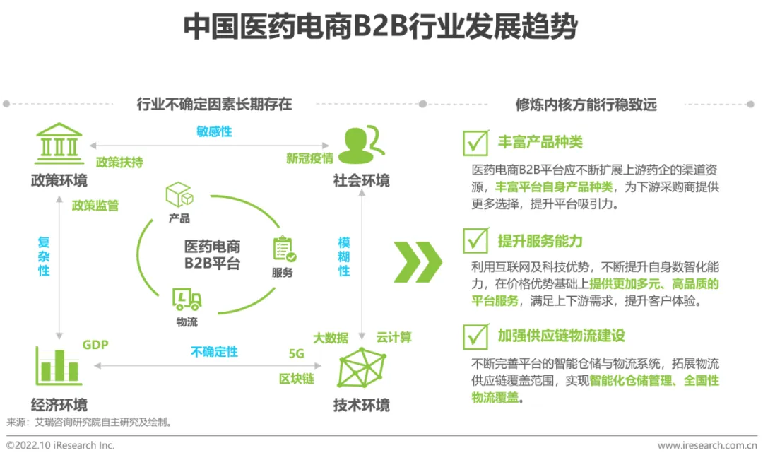 中国医药电商B2B行业正处于高速发展阶段,疫情的物理阻隔为线上购药奠定了习惯基础,处方外流等政策激发院外市场的购药需求,这些为行业发展提供了有利条件。但除此之外,宏观环境尚不稳定,未来严肃医疗趋势下政策监管如何变化,疫情如何走向,新技术如何应用等目前尚无明晰的方向,行业发展的不确定性因素将长期存在。在这一背景下,医药电商B2B平台应注重提升自身,从丰富产品种类,提升服务能力,加强供应链物流建设等方面不断修炼内核,如此方能行稳致远。