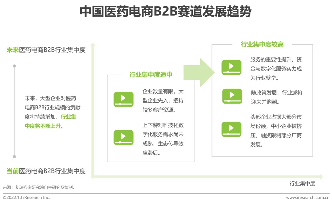 未来医药电商B2B将进入成熟发展期,行业内对各项数字化技术及服务的逐步需求提升,巨头能够凭借其规模优势高速发展,但与此同时中小企业的份额正在不断被挤占。在行业进入方面,先进入者把握大量客户资源,新进入者则需要投入大量人力、物力、财力以建设供应链体系,获取大量用户、形成稳定的流量池愈加困难,行业内具有产品、供应链以及服务等核心竞争力的头部参与者将有更多收益机会。医药电商B2B行业整体呈现强者恒强的格局,马太效应愈加明显。