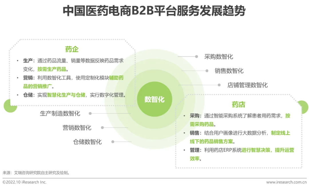 从平台端发展来看,医药电商B2B平台能够利用自身所积累的海量数据及高新技术,进行数智化升级,缩短传播通路,打通信息流,赋能产业链上下游,为各端提供“药品购销+X”的多元化服务。上游药厂方面,平台可以提供更有针对性的药品研发与上市服务,精准识别市场需求;下游药店端,可以利用各类资源,构建千人千面的精准营销体系,提升药店数智化营销与药事服务能力,推动药店数智化运营和管理。