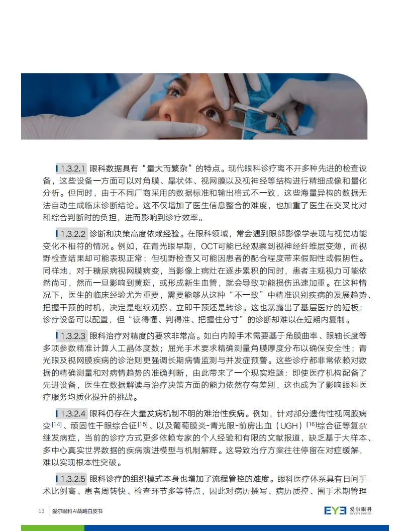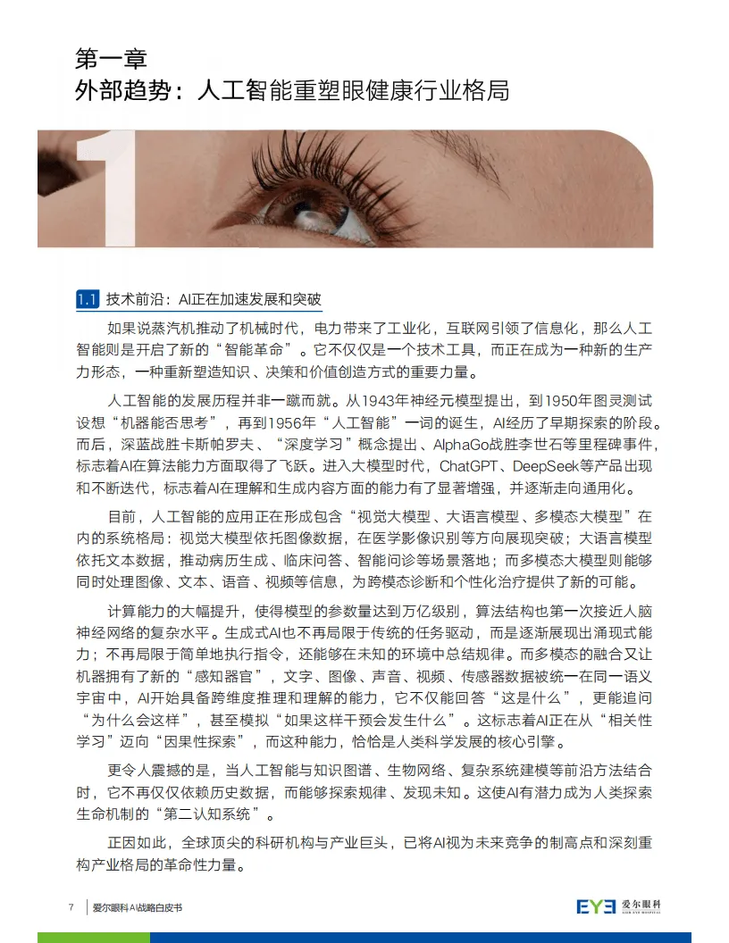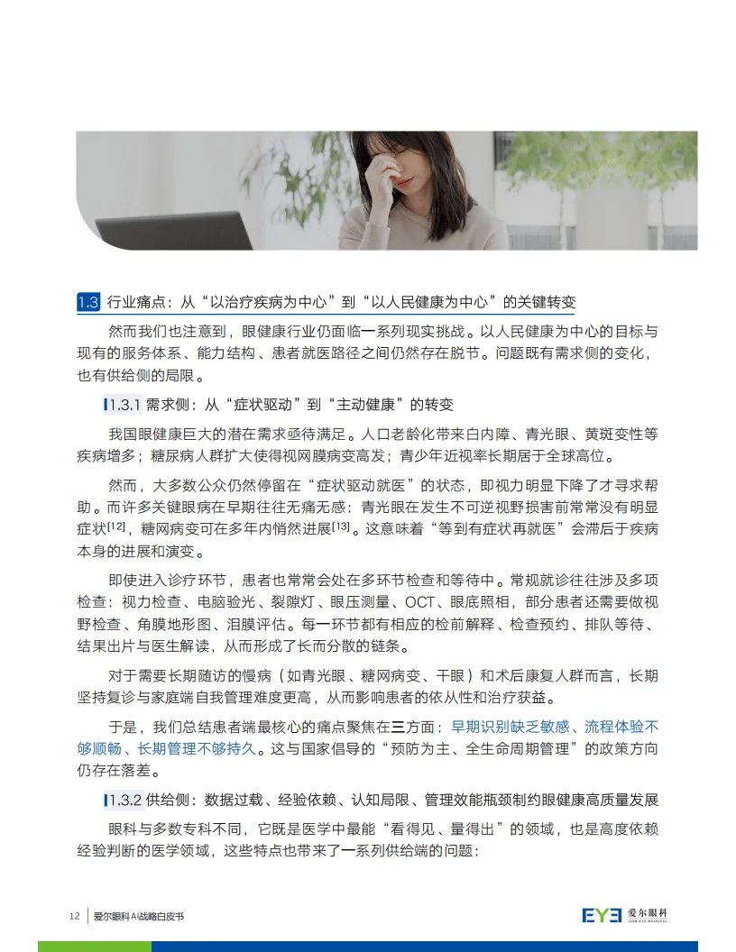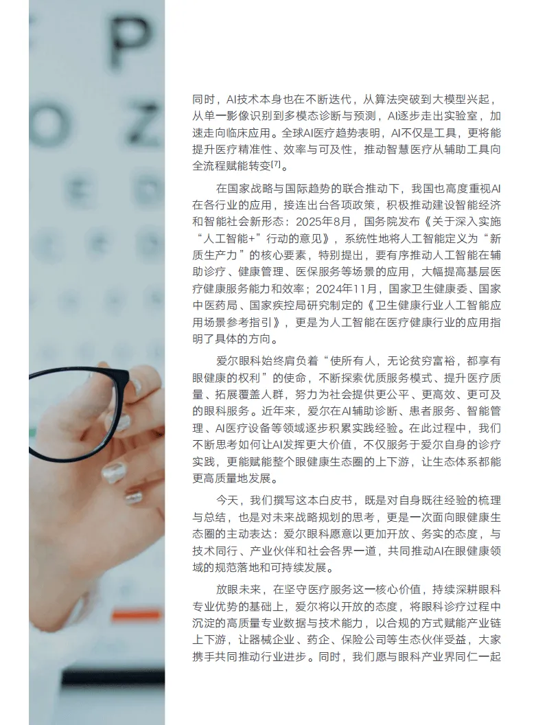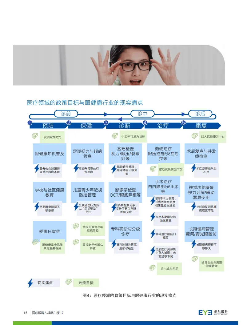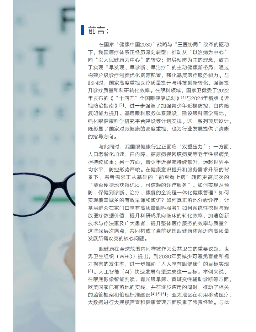 在国家“健康中国2030”战略、“三医协同”改革及眼健康相关政策推动下,我国眼健康行业面临人口老龄化带来的老年性眼病负担加重、青少年近视率攀升的双重压力,同时存在患者从“症状驱动就医”向“主动健康”转变不足、眼科数据繁杂、诊断依赖经验、治疗精度要求高、部分疾病机制不明及诊疗组织模式流程管控难等痛点。全球范围内,AI在眼健康领域已有诸多实践,我国也出台多项政策推动AI与医疗健康融合,为眼健康行业发展提供助力。