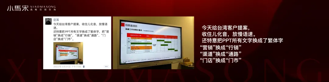 我们经常跟客户说你要站在消费者的角度去思考问题。对我们营销咨询行业,在服务客户时也是一样的。可以看到这张图,在提案时,我们把PPT所有的文字都换成了繁体字,也改变了一些词汇的说法。我们希望通过这种方式能够让客户更好地了解理解我们要表达的东西。