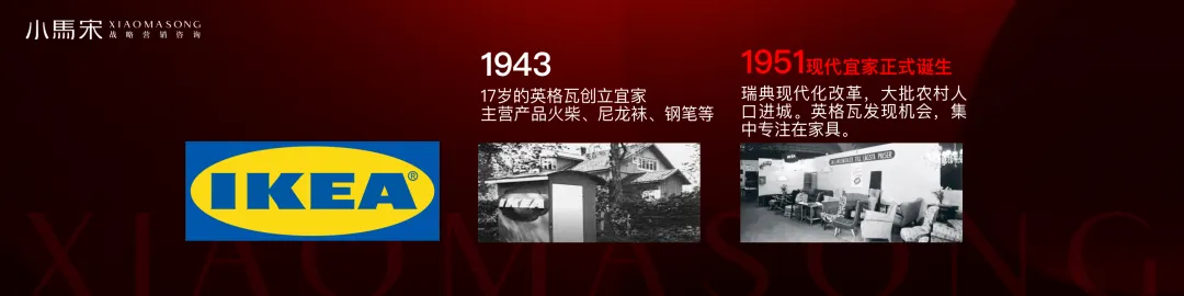 这个伟大的商业故事,转折发生在1951年,宜家在那一年做了一个非常重大的战略决策,由于当时瑞典进行了现代化改革,极大的推动了城市化的进程,大批农村人口进城。这催生了住房需求,同时也极大刺激了家居消费的增长。宜家的创始人英格瓦就发现了这个机会。他立即决定,砍掉其他产品线,All-in家具。所以,1951年才现代宜家诞生的标志。