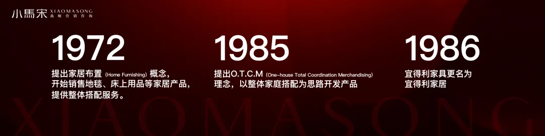其次,1985年,它提出了这么一个新的理念:O.T.C.M理念。简单来说,未来宜得利的产品开发要围绕整个家庭的搭配,围绕整个空间去做。
