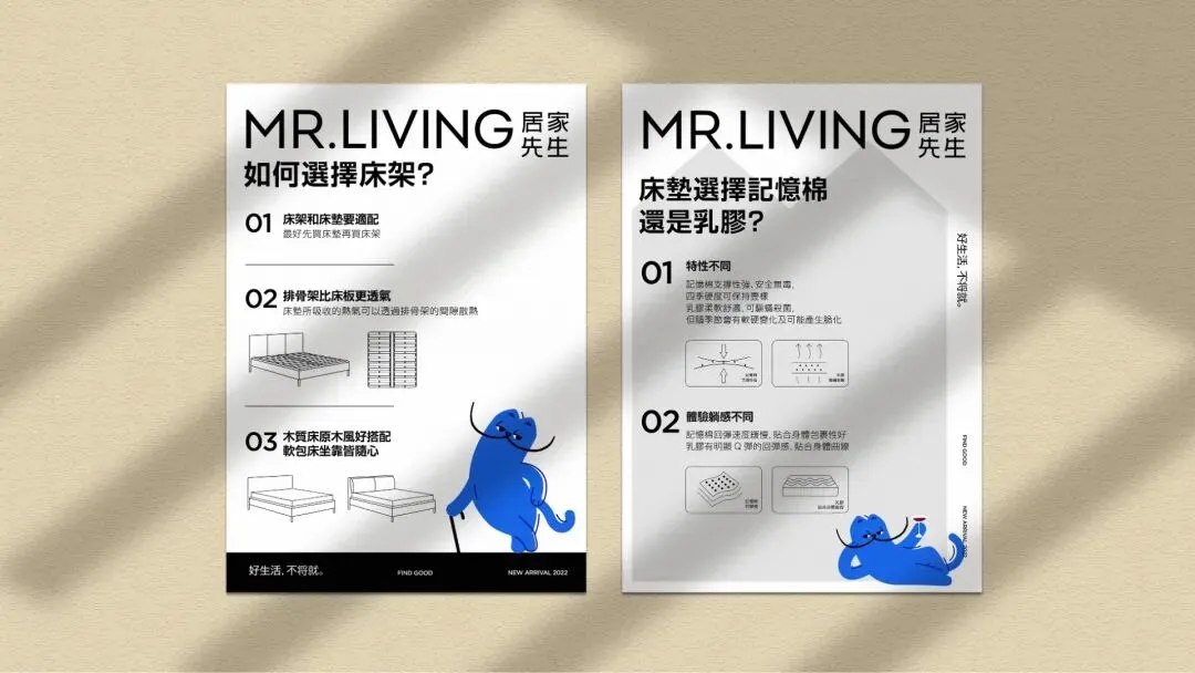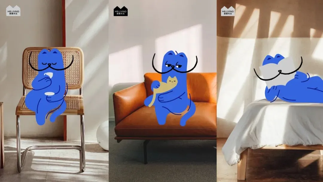一个好的IP形象相当于是品牌免费的代言人,还不用担心这个代言人会有什么舆论风波。IP的设计,还是基于不思而得的联想,居家生活我们会想到什么动物?大多数人想到的是猫,因为猫是全世界数量最多的宠物,所以我们为居家先生找到了猫的形象。
