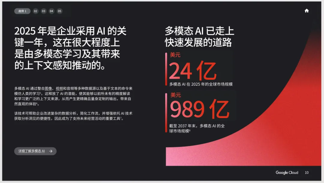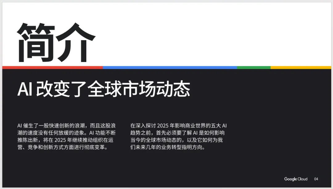 AI催生了一股快速创新的浪潮,而且这股浪潮的速度没有任何放缓的迹象。AI功能不断推陈出新,将在 2025 年继续推动组织在运营、竞争和创新方式方面进行彻底变革。在深入探讨 2025 年影响商业世界的五大 AI趋势之前,首先必须要了解 AI是如何影响当今的全球市场动态的,以及它如何为我们未来几年的业务转型指明方向。