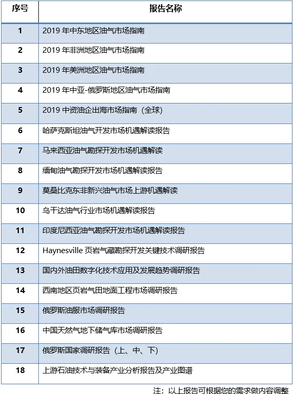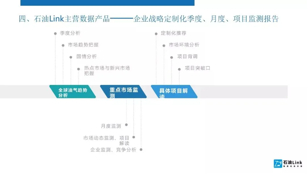 石油Link研究制作了大量行业咨询报告,主要有趋势分析类、市场动态类、竞争情报类、项目解读跟踪类、产品市场体量调研类等数据报告,供企业决策使用。同时根据客户的个性化需求提供定制化咨询,针对石油城市、天然气城市等能源城市的产业链图谱咨询、转型路径咨询、规划和招商咨询。石油Link自2016年底开始布局能源数据积累和监控工作,截至2019年7月已在线监控超过15000个全球数据源点,每天处理50000多条招标信息,通过情报信息整合,对5500家上市油气公司报告进行实时监测,实时监测全球1825个盆地油气信息、20000+个油气坐标及信息、20000+油气公司的6400+油气项目;数据库还涵盖全球3731个地下储油储气库信息、327个LNG站信息、4260个炼油厂信息、170万公里管线信息及200万口油气井信息等。石油Link 全球油气产业情报研究员数量超过 1000 人,形成了覆盖全球主要油气产区的一张线下信息反馈网,支持对线上所获信息进行多点验证,补充完善缺少遗漏之处。保证全面、准确的传递来自当地的市场实际情况。石油Link链接海内外6000余名业内专家与海外200余家优质合作伙伴。针对客户技术需求进行差异化调研及数据需求,能够结合专业机构和行业专家的高度观点,提供深度数据融合支持。每一个咨询专家均出自能源行业,具有丰富的从业经验,对情报信息和市场动态的敏锐嗅觉。经过国际知名经济战略研究专家的培训,在对行业把握、市场分析和发展趋势上具有专业的研判。石油Link产业咨询团队构成分工非常细化,非洲、中东、中亚、俄罗斯、南北美、东南亚等产油大区均由不同的咨询专家负责,从该地区的信息源数据库建立到与当地线下人员沟通,全天候专注研究所在地区的市场动态,分析市场发展,挖掘潜在项目机会。通过科学、严谨的“两会三审”项目操作流程,严格保障项目质量。从客户需求出发,根据专业组建团队,并深入理解和分析需求,根据需求定制研究思路和技术路线。初期评审确保研究方向的正确性,阶段评审确保研究内容的精准性,全方位、多层次、批判性的项目终审确保研究成果满足最终需求。石油Link现已为中石油、中石化、中海油和中化集团的多家二级单位,及多家大型民营企业提供海外市场数据咨询服务。以中东、中亚、非洲、泛俄、南北美为代表的产油区是大家关心的海外市场地区,非常规油气开发、数字油田建设等专题是今年企业最感兴趣的技术领域。石油Link咨询团队在服务过程中体现的专业专注、精益求精,及强大的渠道能力,得到了广大客户的高度认可。石油Link感受到了广大的客户对我们咨询服务的认可与支持,推出以下18篇标准化报告,将专业的咨询服务更多地带给每一家需要的企业。石油Link提供市场环境分析、行业趋势研究、项目背景调查、能源城市转型和以市场动态、趋势分析、公司行为、油气政策为主体的市场咨询服务等。如果您需要以上类型研究报告,欢迎通过以下方式联系:(该系列报告均可依照油气数字化技术、市场按需定制)全球非常规油气CO2压裂技术及配套工艺实践调研报告如果您需要以上类型研究报告,欢迎通过以下方式联系:点击“阅读原文”,下载石油Link APP▼▼