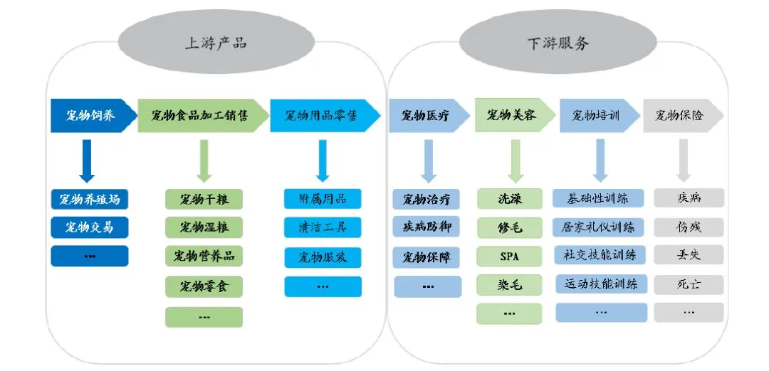 宠物产业链由上游产品和下游服务两大部分组成。
