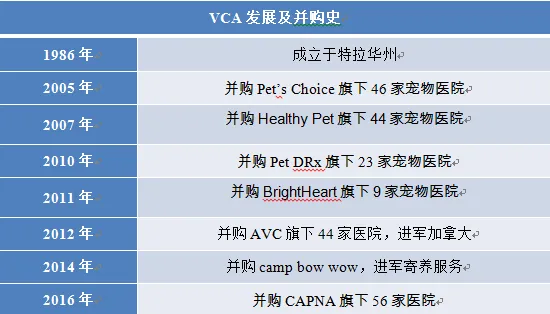 于2017年被玛氏收购的宠物连锁医院VCA成立于1986年,2001年在纳斯达克上市,总部位于美国的洛杉矶。公司的业务主要分布于美国和加拿大,门店数量达到750家,并拥有超过50家的兽医诊断实验室。目前经营和管理由独立动物医院和动物临床实验室组成的网络,提供专门的治疗方法,包括先进的诊断服务、内科、肿瘤科、眼科、皮肤科和心脏病,公司还为兽医行业提供超声波和数字射线照相设备。
