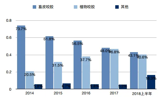 佩蒂股份的主营业务是咬胶,其中畜皮咬胶的占比从2014年的73.7%下降到了2018上半年的43.1%,植物咬胶占比从2014年的20.5%上升到2018上半年的40.6%。佩蒂股份代工出口业务占比从2014年的98.55%下降到了2018上半年的95.18%。
