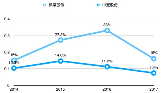 从盈利能力来看,佩蒂股份的毛利率和净利率都高于中宠股份,ROE也在2017年超过中宠股份,主要原因是营业成本和销售成本较高。我们已经知道营业成本的差别主要在于产品原材料不同,而销售成本的差别主要在于业务宣传服务费。2017年中宠股份的业务宣传服务费达到2745万,占销售成本的40.6%,佩蒂股份2017年的业务宣传服务费只有264万,占销售成本比重11.3%。