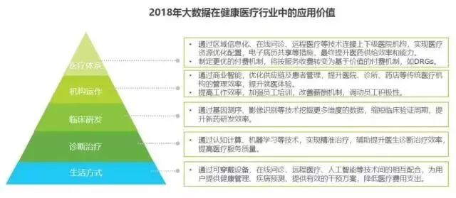 大数据技术的应用,将从体系搭建、机构运作、临床研发、诊断治疗、生活方式五个方面带来变革性的改善。由于我国医疗体系的强监管性,大数据若要在行业内实现其价值,需由国家建立一套自上而下的战略方针,从而引导医院、药企、民办资本、保险等机构企业构建项目,相互合作,最终实现从 “治疗” 到 “预防” 的就医习惯的改变,降低从个人到国家的医疗费用。
