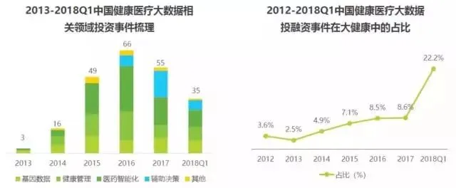 对医疗健康投融资数据进行分类整理发现,2014 年起健康医疗类大数据投融资事件增多,2016 年最多共 66 起,2017 年略有下降。2018 年,健康医疗大数据仅在 Q1 便发生了 35 起投融资事件,其中 12 件来自医疗信息化建设,多为利用 AI 、语义识别、数据模型,挖掘诊疗信息,连接院内院外平台等类别的企业。受人工智能热潮影响,2017 年辅助决策类共发生 17 次投融资事件,2018 Q1 共 5 起,预计未来将会有更多资本进入该领域。