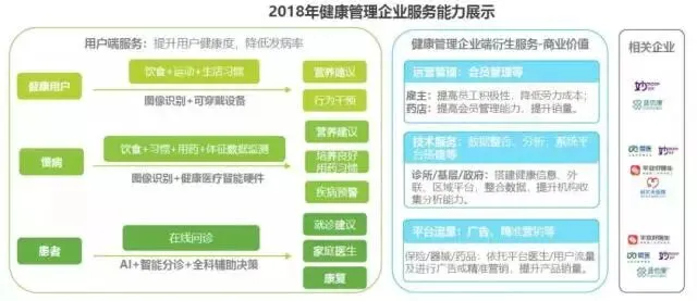 随着行业发展,产品、用户教育及上下游产业的逐渐成熟,服务于用户端的企业将迎来无限商机。如,影像识别、基因测序在经过临床验证后,作为常规检测项目,将列入医保或健康险的可报销项目。健康慢性病管理场景下,用户线上进行的建议、干预、上下转诊等健康或轻医疗服务的收费模式也将更加灵活多变,形成以按次、按会员、按年卡等多种收费形式。