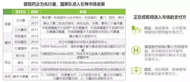2016 年,21 家医院的肿瘤专家与 IBM Watson 进行合作获得个性化服务。药企,如默沙东,2015 年将人工智能技术应用到药品研发中。随后,在 2016、2017 年,更多的药企、体检机构通过合作、收购等方式先后进入市场。在市场初步探索后,政府、医院、药企、体检等企业将成为健康医疗大数据的主要支付方。