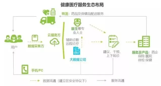 在健康管理、慢性病管理以及诊前、诊中、诊后环节打通的场景下,单家企业或机构的服务供给能力有限。只有依赖多方角色协同合作,配合提供健康医疗服务,才能满足用户需求。未来健康医疗产业中的胜出方,不单再是个体,而是不同领域的企业共同合作完成的生态体系。因此,企业在构建核心优势的同时,还需要具备战略眼光,及发现投资优秀合作伙伴的能力。该体系的核心产业包括健康医疗大数据公司、医生、健康医疗服务提供方,辅助产业包括数据采集方(智能硬件、区域信息平台)、运营商、物流服务、云服务等。