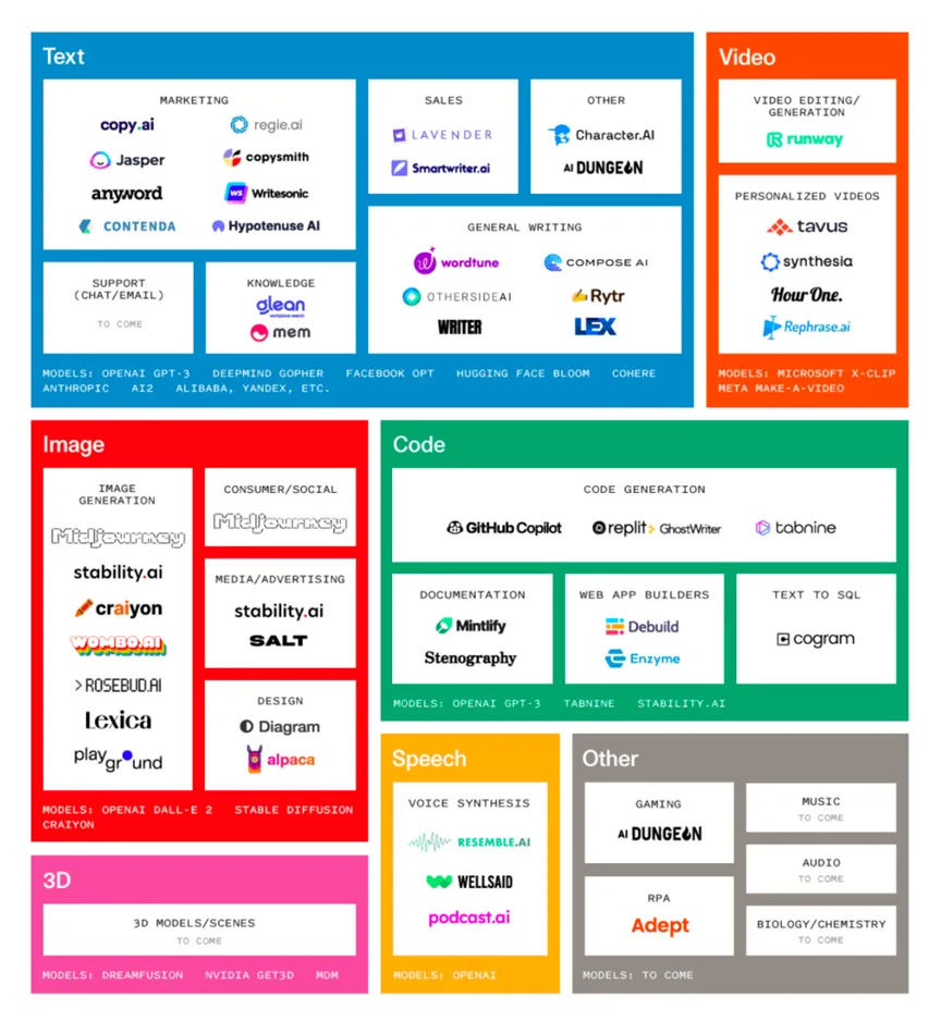 目前,从提供预训练的AI大模型的基础设施层公司到专注打造垂直领域内AIGC工具的中间层公司、再到直接面对消费者和终端用户提供产品和服务的应用层公司,美国围绕AIGC生长出繁荣的生态,技术创新引发的应用创新浪潮迭起;中国也有望凭借领先的AIGC技术赋能千行百业。