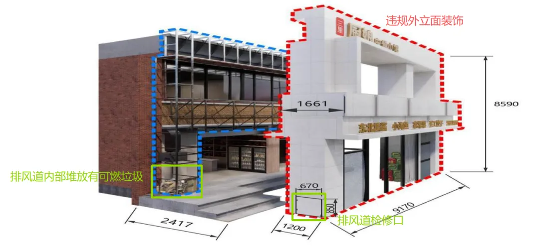 3.外立面装饰装修包裹烟道形成烟囱效应,致使火势迅速蔓延至二层形成立体燃烧。