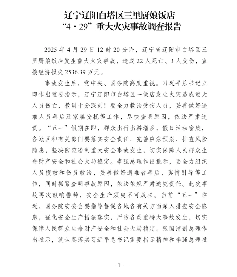 2025年4月29日12时20分许,辽宁省辽阳市白塔区三里厨娘饭店发生重大火灾事故,造成22人死亡、3人受伤,直接经济损失2536.39万元。