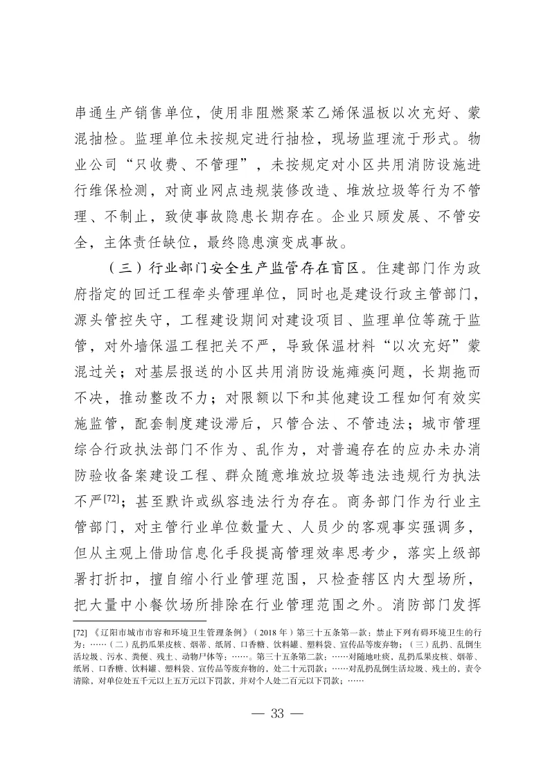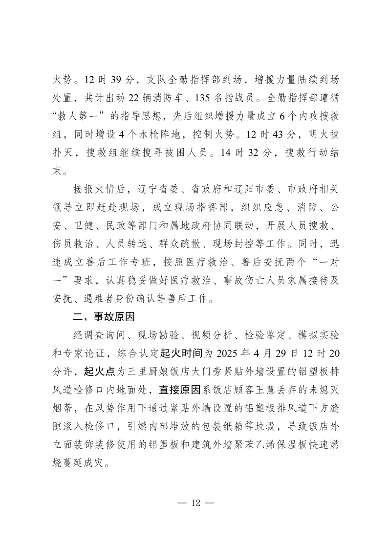 调查认定,这是一起因饭店主体责任不落实,违法改造扩建外立面且大量使用以普通塑料为芯材的铝塑板,违规在门外排风道下方检修口内堆放可燃垃圾,顾客随意丢弃烟蒂,外墙保温材料以次充好,消防设施损坏未及时修复,初期火灾处置不力,属地有关部门及党委、政府履职不到位而导致的重大生产安全责任事故。
