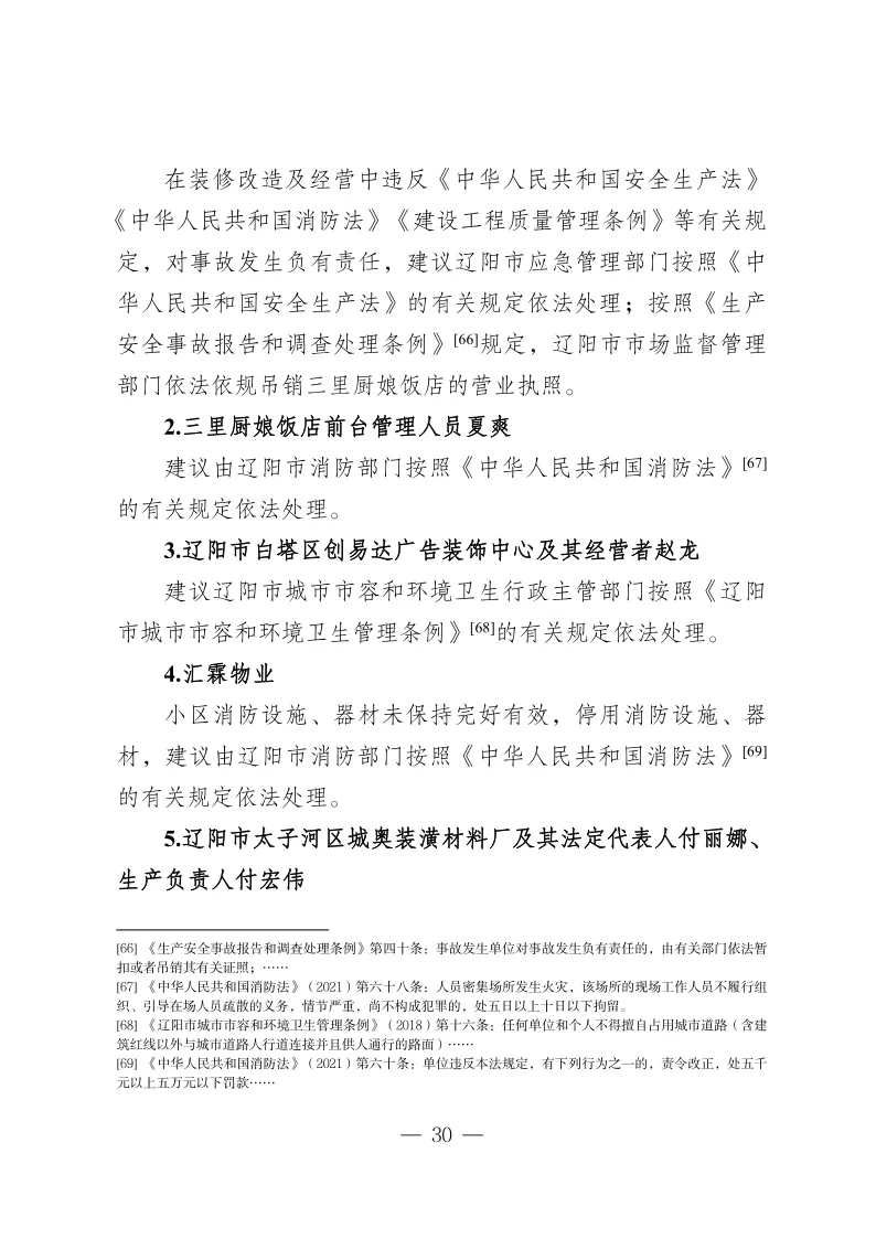 调查报告建议对三里厨娘饭店经营者等8人移送司法机关。针对事故中暴露的问题,辽宁省纪委监委也同步成立火灾事故追责问责审查调查组,依规依纪依法对重大火灾事故中负有责任的40名公职人员进行严肃追责问责。