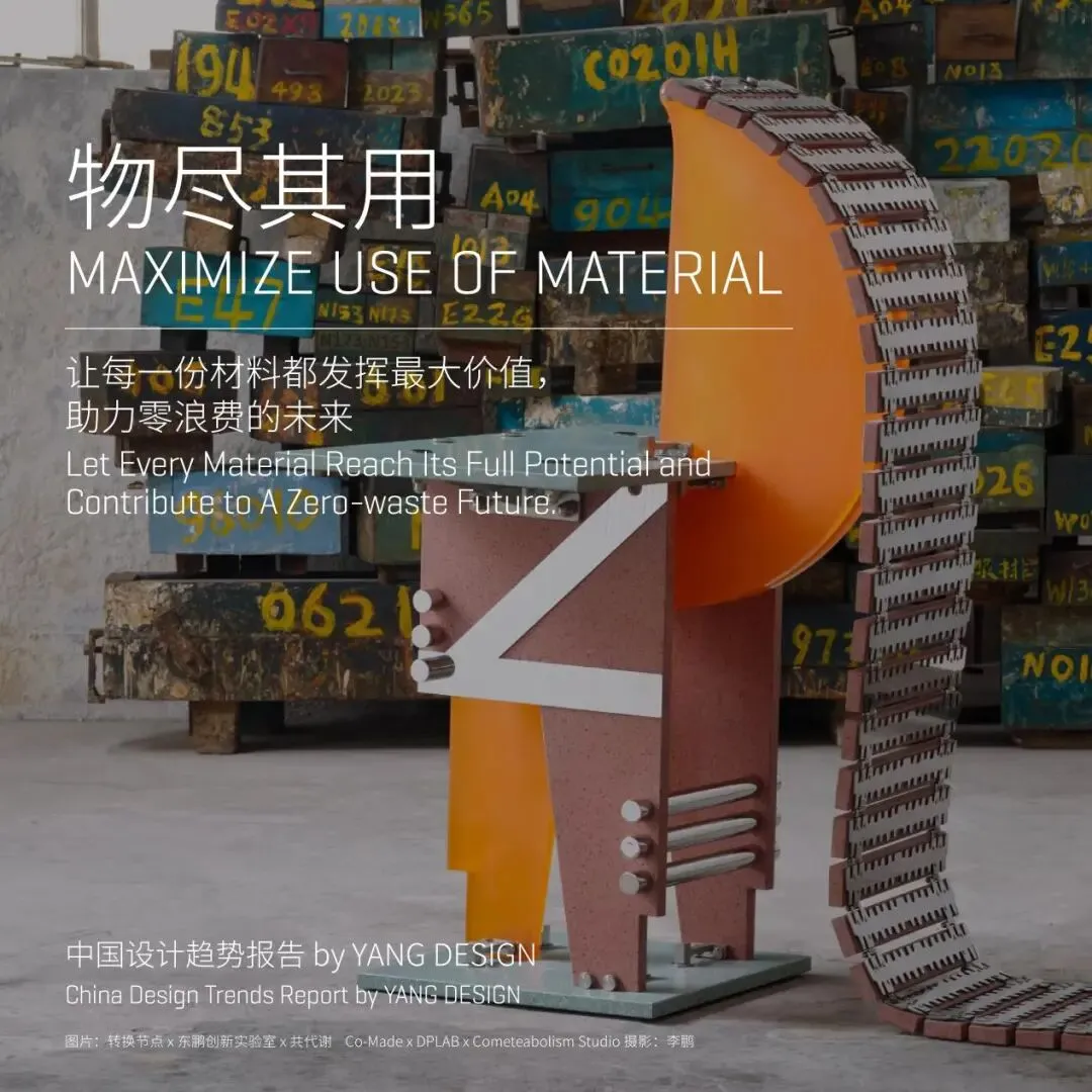 在降格消费和降碳意识增强材的背景下,“物尽其用”代表了一种低能耗、高效率的设计方法,同时也是对现代消费逻辑的反思。这一可持续理念主张新旧混合,通过对废旧物品、边角余料或垃圾的再利用与再设计,将其转化为具有实际功能的新材料或新产品。这一过程不仅延长了物品的生命周期,也赋予了其新的意义与使用场景。