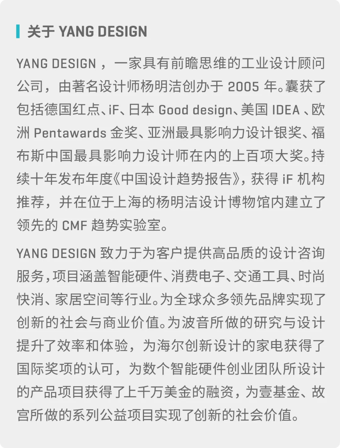"YANG DESIGN is a CMF leader with feasible ." - Senior Innovation Director, VIVO
