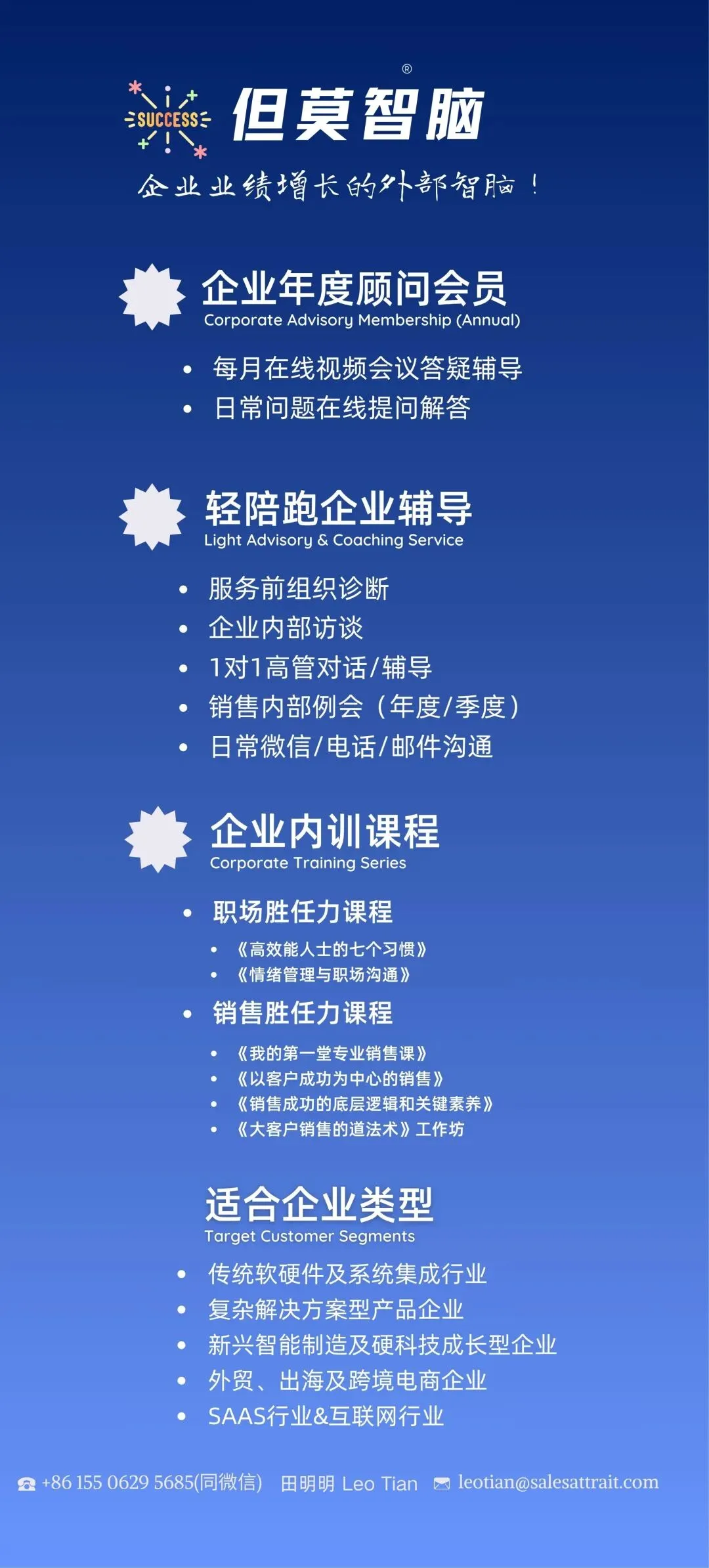 2年+行业操盘手(汽车行业&大消费行业)实战经验,全链路负责LTC(线索到现金);4年二线销售团队管理和4年一线销售团队管理经验;累计销售辅导经验超过12,000小时,从事一线销售管理期间每年业绩平均达标率超过80%,每年团队均有TopSales产生,达标率最高超过300%,三年达标率平均超过110%;