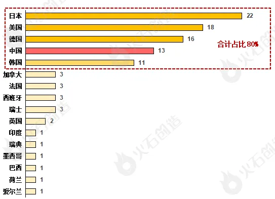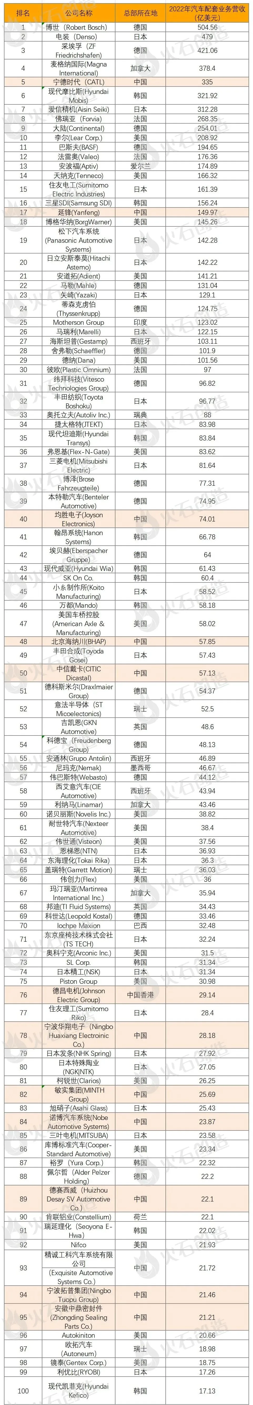 通过对2023年全球汽车零部件供应商百强企业的区域分布情况进行分析,百强企业分别来自16个国家,日本、美国、德国、中国、韩国、加拿大、法国、西班牙、瑞士、英国、印度、瑞典、墨西哥、巴西、荷兰、爱尔兰分别各有22、18、16、13、11、3、3、3、3、2、1、1、1、1、1、1家企业上榜。其中,日本、美国、德国、中国、韩国入围企业共计80家,比2022年增加了8家,占比高达80%。