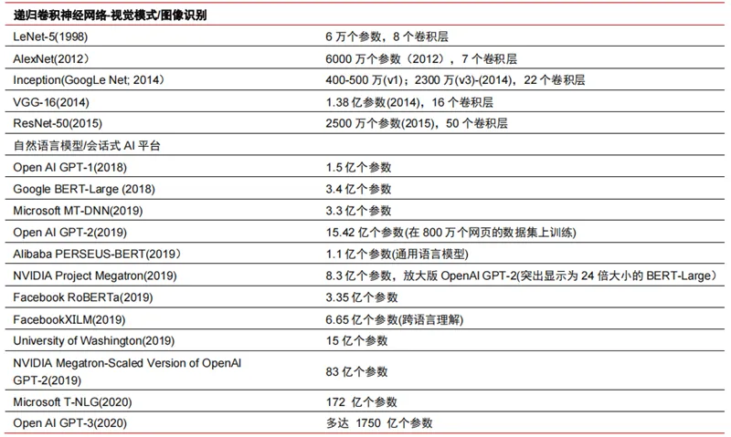 Tensorflow(产业界)、PyTorch(学术界)逐步实现主导。谷歌推出的 Tensorflow为主流与其他开源模块如 Keras(Tensorflow2 集成了 Keras 模块)、Facebook 开源的PyTorch 等一起构成了目前 AI 学习的主流框架。Google Brain 自 2011 年成立起开展了面向科学研究和谷歌产品开发的大规模深度学习应用研究,其早期工作即是 TensorFlow 的前身 DistBelief。DistBelief 在谷歌和 Alphabet 旗下其他公司的产品开发中被改进和广泛使用。2015 年 11 月,在 DistBelief 的基础上,谷歌大脑完成了对“第二代机器学习系统”TensorFlow 的开发并对代码开源。相比于前作,TensorFlow 在性能上有显著改进、构架灵活性和可移植性也得到增强。Tensorflow 与 Pytorch 虽然本身是开源模块,但因为深度学习框架庞大的模型与复杂度导致其修改与更新基本完全是由谷歌完成,从而谷歌与 Facebook 也通过对 Tensorflow与 PyTorch 的更新方向直接主导了产业界对人工智能的开发模式。
