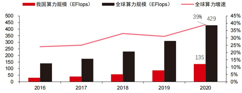 过去算力发展有效缓解了人工智能的发展瓶颈。人工智能作为一个年代久远的概念,过去的发展一直受限于算力不足,其算力需求的主要来源于两个方面:1)人工智能最大挑战之一是识别度与准确度不高,而要提高准确度就需要提高模型的规模和精确度,这就需要更强的算力支撑。2)随着人工智能的应用场景逐渐落地,图像、语音、机器视觉和游戏等领域的数据呈现爆发性增长,也对算力提出了更高的要求,使得计算技术进入新一轮高速创新期。而过去十几年算力的发展有效缓解了人工智能的发展瓶颈,未来智能计算将呈现出需求更大、性能要求更高、需求随时随地且多样化的特点。由于接近物理极限,算力增长的摩尔定律逐步失效,算力行业正处于多要素综合创新阶段。过去算力供应提升主要通过工艺制程微缩,即在同一芯片内增加晶体管堆叠的数量来提高计算性能。但随着工艺制程不断逼近物理极限,成本不断提高,使得摩尔定律逐渐失效,算力产业进入后摩尔时代,算力供应需要通过多要素综合创新提高。当前算力供给有四个层面:单芯片算力、整机算力、数据中心算力和网络化算力,分别通过不同技术进行持续演进升级,以满足智能时代多样化算力的供给需求。此外,通过软硬件系统的深度融合与算法优化提升计算系统整体性能,也是算力产业演进的重要方向。算力规模:根据中国信通院 2021 年发布的《中国算力发展指数白皮书》,2020 年全球算力总规模依旧保持增长态势,总规模达 429EFlops,同比增长 39%,其中基础算力规模 313EFlops、智能算力规模 107EFlops、超算算力规模 9EFlops,智能算力占比有所提高。我国算力发展节奏与全球相似,2020 年我国算力总规模达到 135EFlops,占全球算力规模的 39%,实现 55%的高位增长,并实现连续三年增速保持 40%以上。