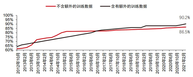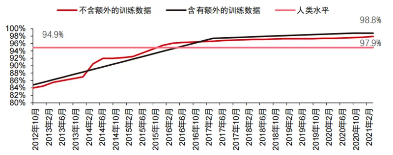 在卷积神经网络的推动下,计算机视觉准确率测试成绩明显提升,正处于产业化阶段。计算机视觉准确率在过去的十年中取得了巨大的进步,这主要归功于机器学习技术的应用。Top-1 准确度测试人工智能系统为图像分配正确标签的能力越强,那么其预测结果(在所有可能的标签中)与目标标签越相同。在有额外的训练数据(例如来自社交媒体的照片)的情况下,2021 年 1 月在 Top-1 准确度测试上每 10 次尝试中会出现 1 次错误,而 2012年 12 月每 10 次尝试中会出现 4 次错误。而另一项精确率测试 Top-5 会让计算机回答目标标签是否在分类器的前五个预测中,其准确率从 2013 年的 85%提高到 2021 年的 99%,超过了代表人类水平的成绩 94.9%。