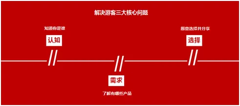 通过品牌的展现,可以让游客知道我们是谁、了解我们有哪些产品能够满足他们的需求、同时愿意选择我们的旅游目的地并分享给他人。因此,旅游品牌需要解决的,就是游客的三大问题——认知问题,需求问题,选择问题。