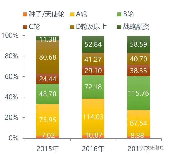 从不同投资阶段的分类统计对比2015年至2017年的投资数据显示,2017年早期投资阶段(A轮及以前)的案例数量依然占有较大比重,但相比前两年,早期投资阶段的数量占比开始降低,2017年下降到27.46%。