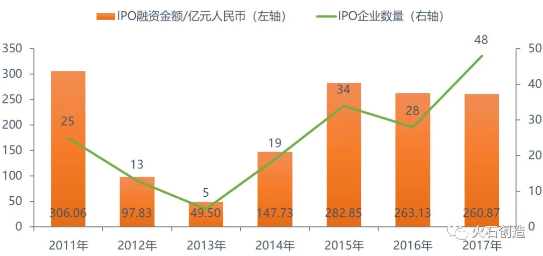 2011-2017年中国医疗健康行业IPO企业数量及IPO融资金额