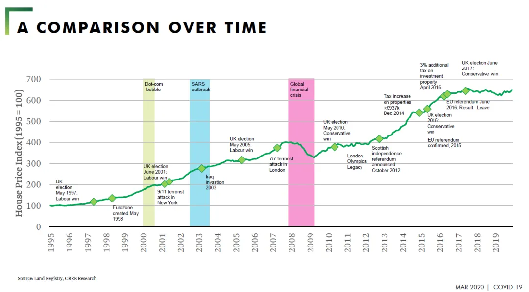 从1995年到2019年,伦敦房价一直在稳步上涨,经历英国大选、911事件、英国脱欧公投等重大事件时都没有明显波动,只在08年的金融危机才出现了大幅度的震荡。