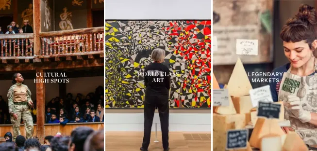 在全球现代美术界里享誉盛名的泰特当代美术馆、知名的当代艺术画廊The White Cube Gallery 白立方画廊、吸引着资深戏剧迷的莎士比亚环球剧场、新老维克两大剧场及英国国家剧院,都等待你慢慢探索。