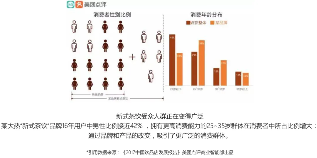 第四点,定价机制与促销的僵化,现在高端现做茶饮类别市场在某些市场区域已经是供大于求了,话题性和新鲜感也没有原来那么强烈了,原有的定价机制是否能适应现在的市场环境呢?例如,多数情况下在购买时是没有及时优惠的,而采用的还是较为古老的办卡优惠机制,但是这需要特别熟悉你的品牌的消费者才知道,如何买能享受到优惠。只有间接优惠没有及时优惠,不能高效刺激消费者付出及时的购买行为。第五点,未采用小数定价方法,略有吃亏。例如一款产品,你卖24.98元与卖25元,虽然只差了一分钱,但是给消费者带来的感受则完全不同。而定价是24.9与24.98在营收上也会有比较大的茶比。这类定价细节上的忽略,会减少产品定价的灵活性,导致定价的可接受程度下降,营收空间降低等一系列综合影响。由此可见,高端现做茶饮类别需要的不仅是直接降价,更加需要的是对整个价格系统做重新的结构性调整。还是那句话,热度已然散尽,现在才是打硬仗的时候,如果价格系统不做结构性调整,未来仍然会面临诸多问题。我早前就在朋友圈里说过:现做茶饮类别定类创新后,会形成一段时间的需求红利期,消费者对价格不敏感,喝到才重要。这是奶茶类别首次站上20元+的大关口,当时分析杯单可以做到23元~25元之间,相比于传统奶茶8元~13元的杯单已经倍升。而此时主流产品的定价原则上要通过上新降价的形式,扩充23元左右产品占比,巩固价格和价值的认知,再通过新品降价,让次主流产品的价格下探到16-18元之间,这样整体的价格空间就比较舒适。既保持了品牌价值认知,又踩住了中端品牌的高价值产品。伴随需求红利半衰期同步控制价格和产品,要比现今一下子全线产品降价要好得多,无论是消费市场还是资本市场都能购接受。瑞幸所在的咖啡类别与喜奈正好相反,从价格和产品的节奏上来说,瑞幸无疑做的更好。与此同时在2020年的时候,超大店的影响已经由正转负了,具体来说就是:定价跃迁的使命完成后,超大店便开始成为了单店盈利的负担了。基本上多数消费者都知道了新茶饮的主流价格区间了,并且已经认同了这个价格区间了。那么,超大店的历史使命就已经完成了,在下沉的时候,顶多一个城市两个大店,其他都是中小店。就是卖空间的茶饮店与卖茶饮的茶饮店的比例问题。这个问题在此就不赘述了,想要具体了解的可以去看看懂消费001期节目。通过几个高端现做茶饮类别的品牌共同突围,奶茶更名新茶饮实现类别突围,成功扭转了过去的负面认知。成功进入了主流话语讨论体系中,变成了人们日常经常提及的类别了。这是高端现做奶茶类别的功劳,无论是成功的还是失败的,军功章有它们的一部分。认知影响了消费者的行为频率,这是类别发展获得的重要成绩,我们在第五部分再做进一步论述。多说一句,如果不是2020年发生的重大变故,中国所有类别的价值重估就会进入快车道,但是一场世界性的变故影响了这个节奏,当多数行业表现出降薪裁员的时候,就说明劳动力价格重估的停滞。说回正题,与此同时,人群范畴的扩大也是增量市场原因之一,从原有的低龄化、女性化为主的类别人群构成,变成了全年轻段、相对中性化的人群构成,虽然女性群体依然占据多数,但是已由原来的绝对多数比例变为少数多数比例了。大家看一下2017年的人群数据图,就清楚了这个变化有多明显了。因为定价的提升配以门店位置的变化,购买人群的高收入趋势在早期现做茶饮类别发展是能够中明显感受到的。公司的集中下午茶采购或是同事之间自主选择采购的下午茶,已经由咖啡占绝对主导转为咖啡和现做茶饮分庭抗礼的局面了。