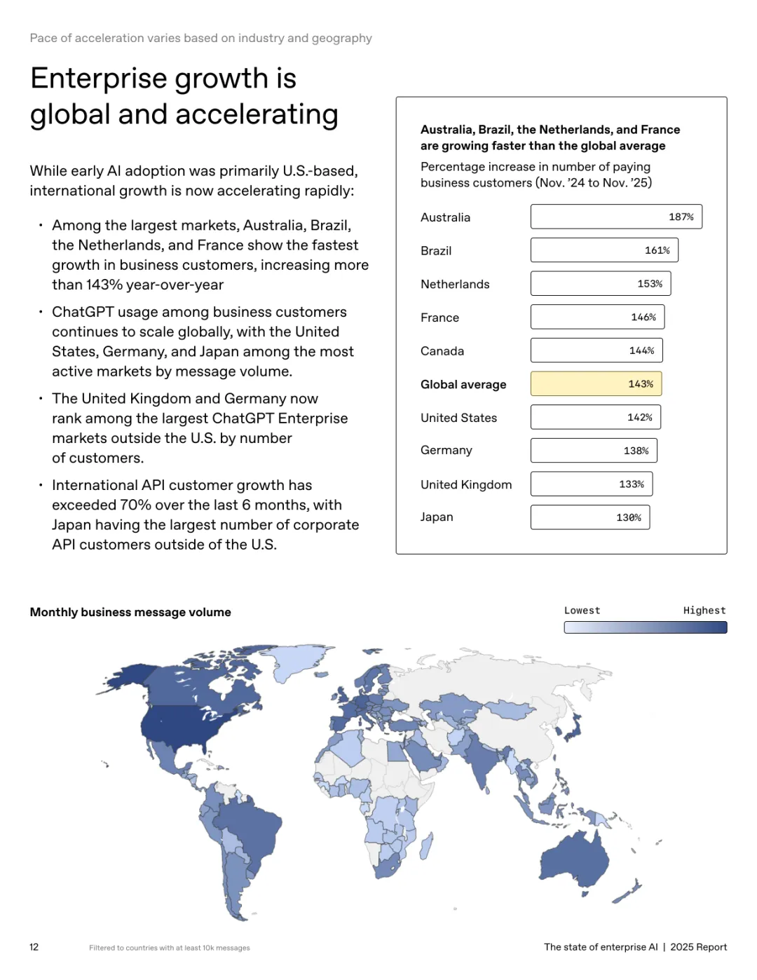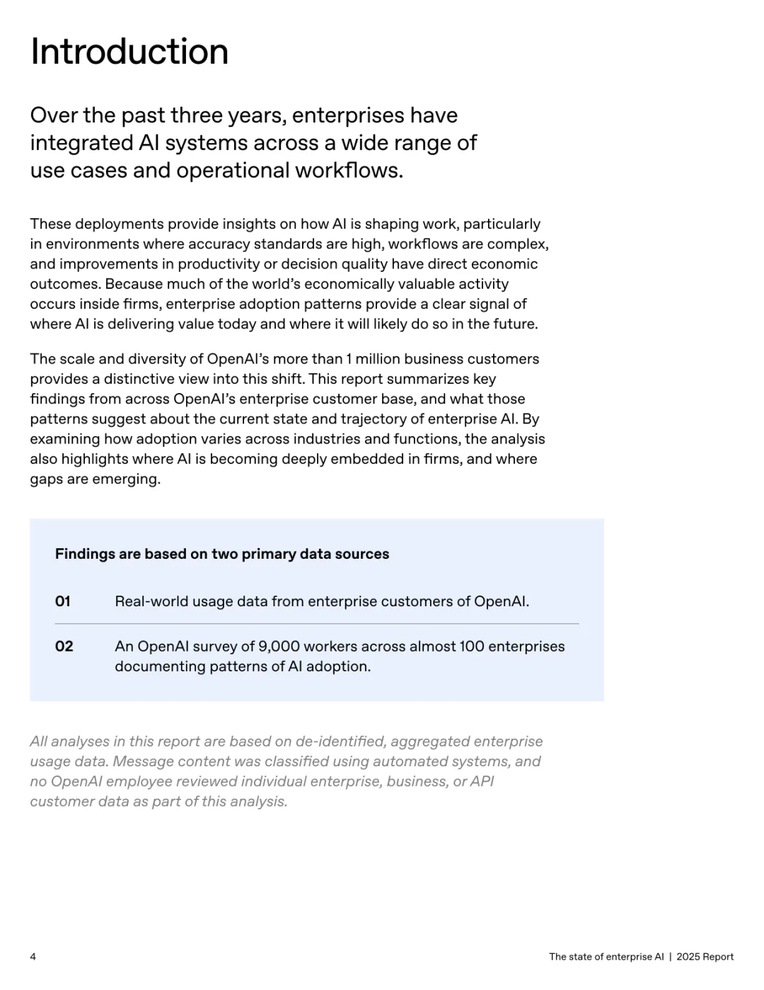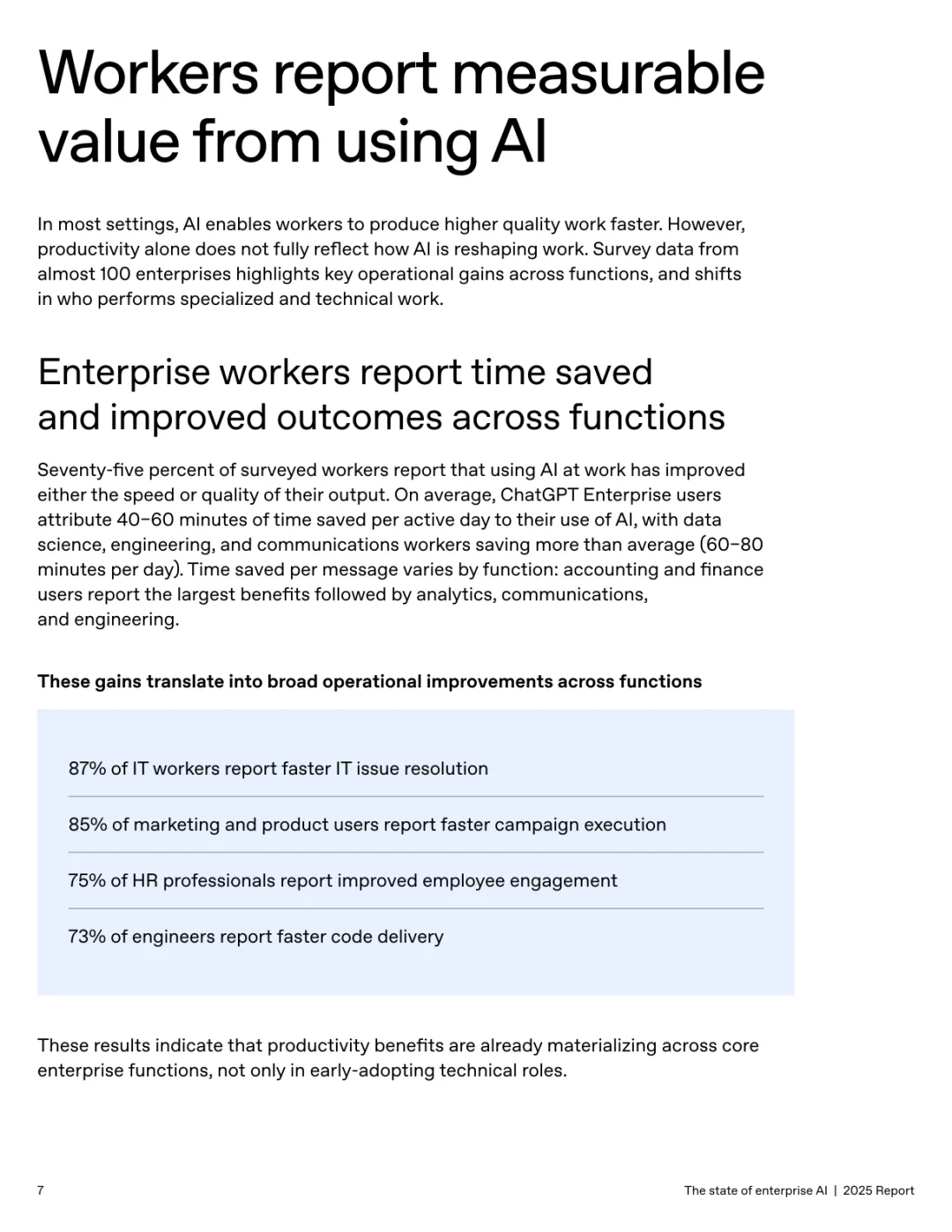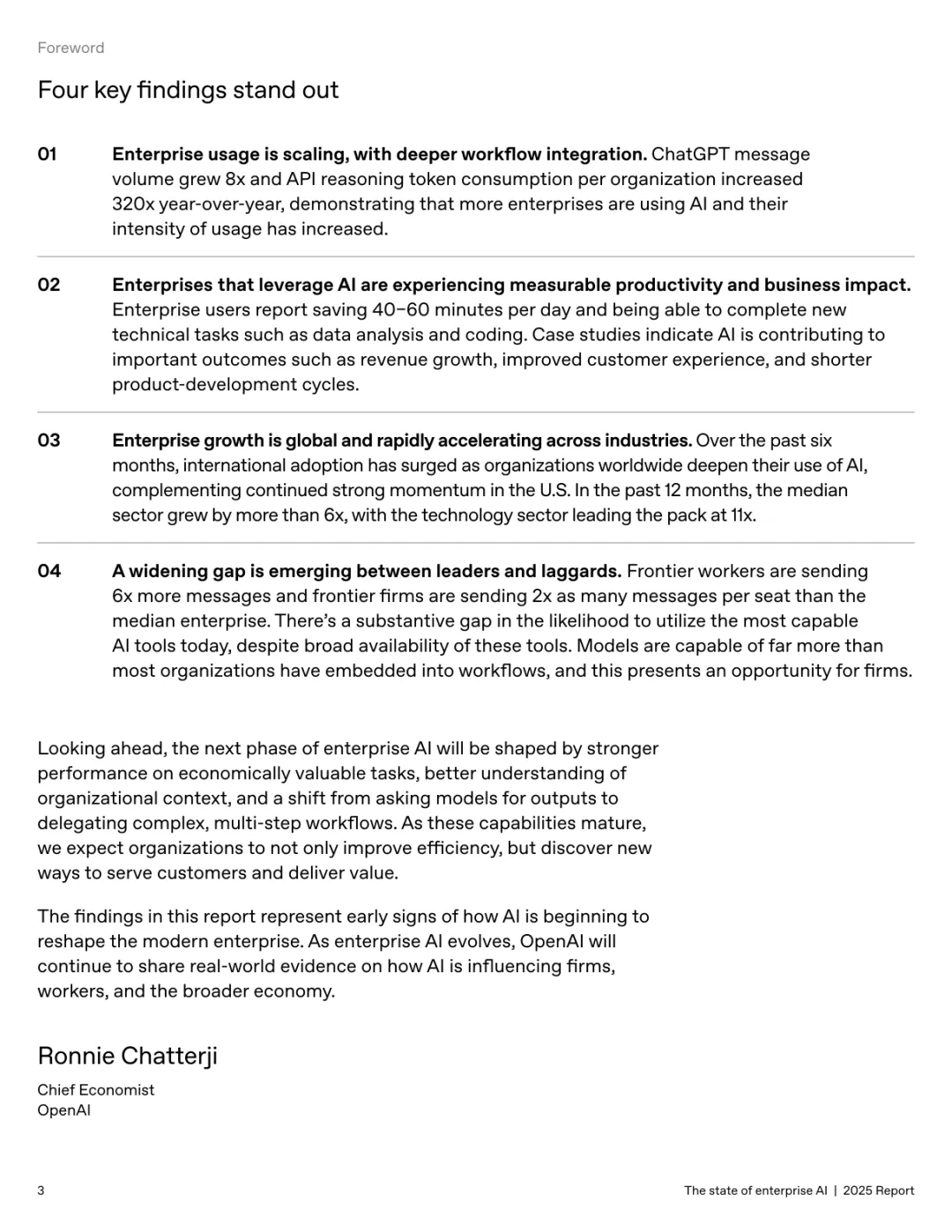 导读:报告基于超 100 万企业客户的使用数据及 9000 名员工调研,系统呈现企业人工智能应用的现状、价值与趋势。企业 AI 应用正加速规模化并深度融入工作流,ChatGPT 企业版座位数同比增长 9 倍,API 推理令牌消耗增长 320 倍。定制化 GPT 和项目功能的周活跃用户同比增长 19 倍,20% 的企业消息通过这类工具处理,展现出强劲的落地动能。全球各行业 adoption 全面提速,科技行业年增长 11 倍领跑,医疗、制造业紧随其后,国际市场中澳大利亚、巴西等国增速超 143%。AI 为企业带来显著价值,员工日均节省 40-60 分钟,75% 的受访者能完成此前无法胜任的任务,涵盖数据分析、编码等技术工作。案例显示,AI 助力企业实现营收增长、客户体验优化及产品开发周期缩短。但企业间应用差距正扩大,前沿企业人均消息量是普通企业的 2 倍,未来需通过系统集成、工作流标准化与变革管理,充分释放 AI 的商业潜力。